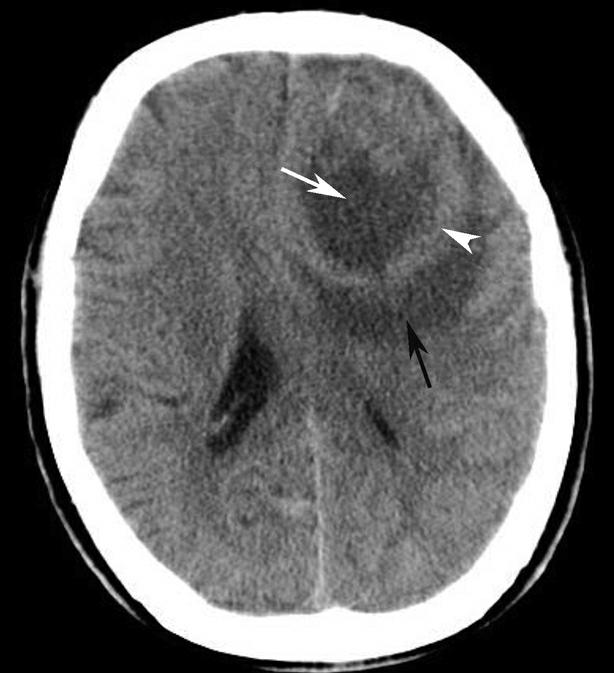 左侧额叶不甚规则的囊实性占位性病变,囊性部分呈低密度(白箭),实性部分呈等密度(白箭头);周围见脑水肿(黑箭)。左侧侧脑室前角明显受压,中线结构右移