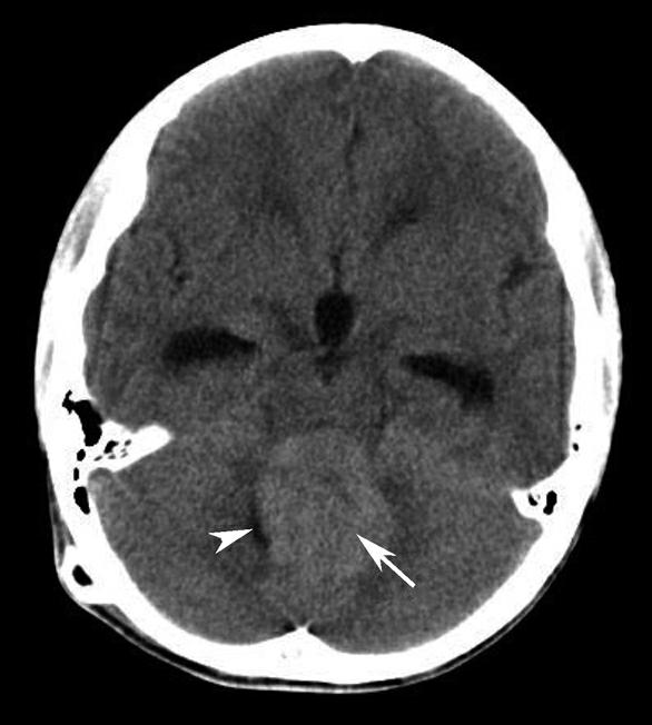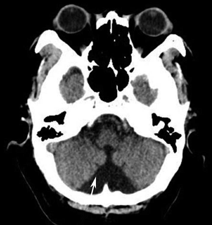 小脑蚓部可见一类椭圆形稍高密度影(箭),边缘尚清,第四脑室受压变形(箭头);幕上脑积水