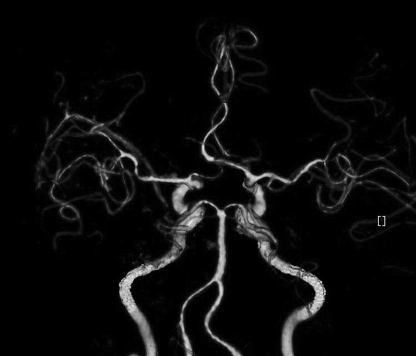 CTA示大脑前、中、后动脉主干迂曲僵硬