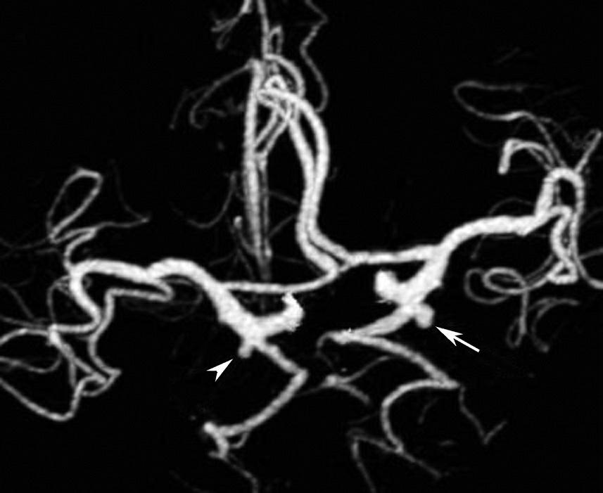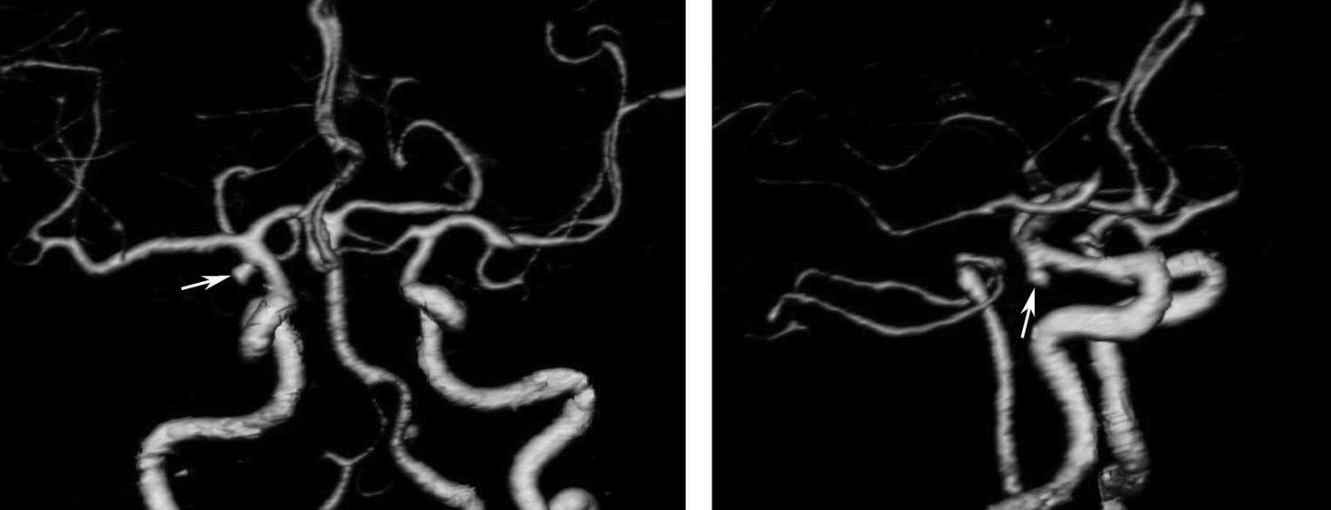 双侧大脑后动脉各见一宽颈、囊状动脉瘤(箭、箭头)