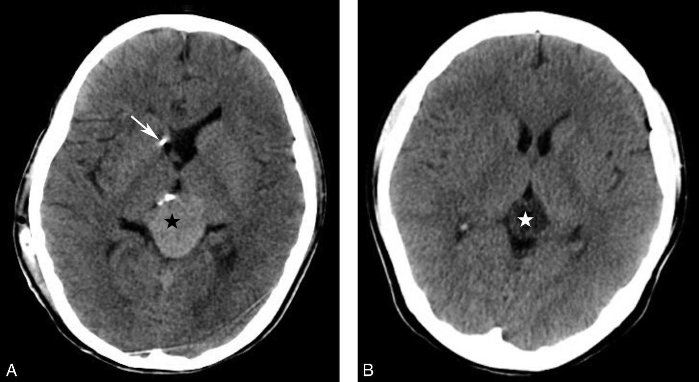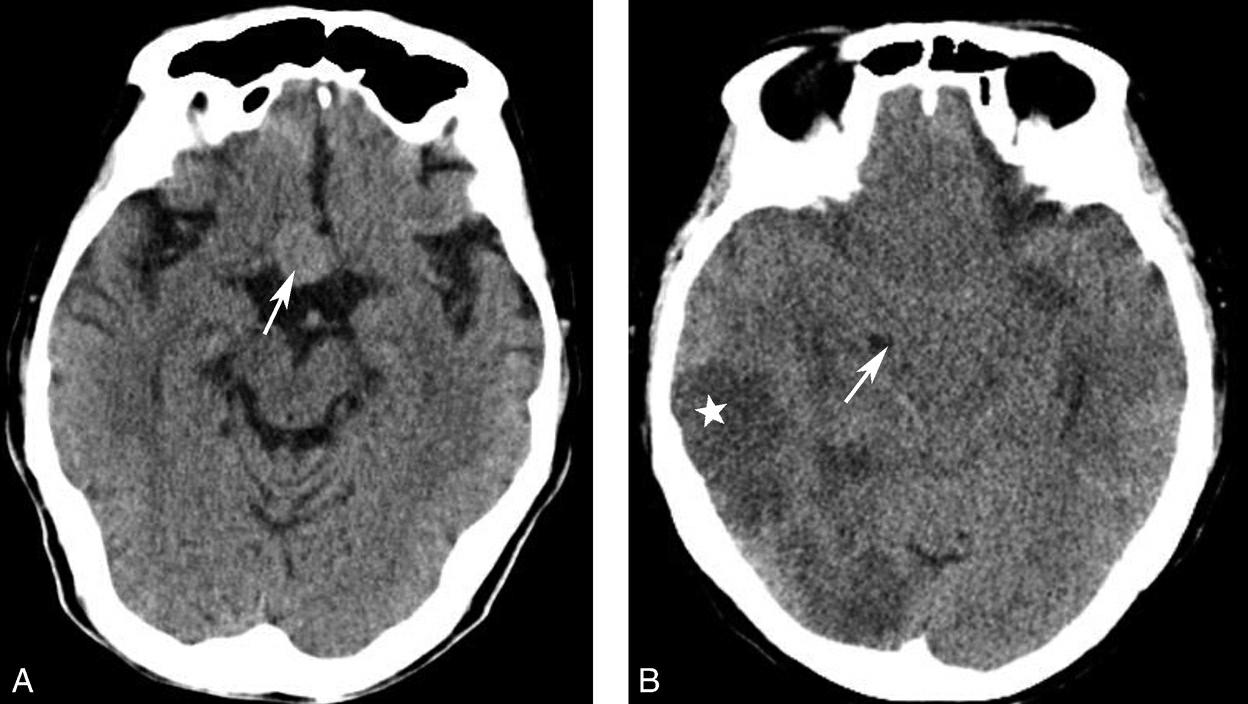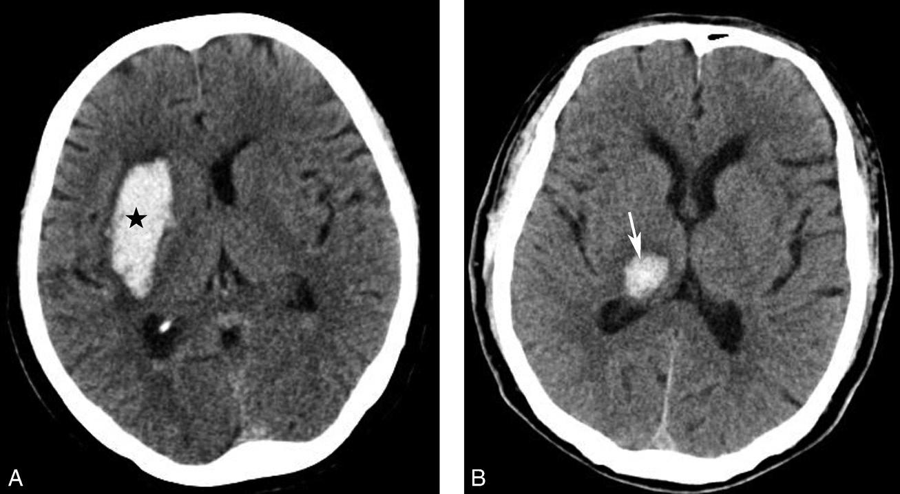 A.右侧壳核脑出血,形成高密度血肿(★);B.右侧丘脑出血,呈球形高密度影(箭)