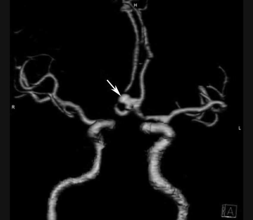 CTA示前交通囊状动脉瘤,瘤颈较宽