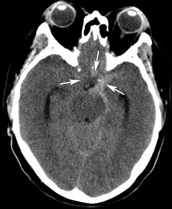 左侧颈内动脉瘤破裂,血液进入鞍上池,导致其密度明显升高(箭)