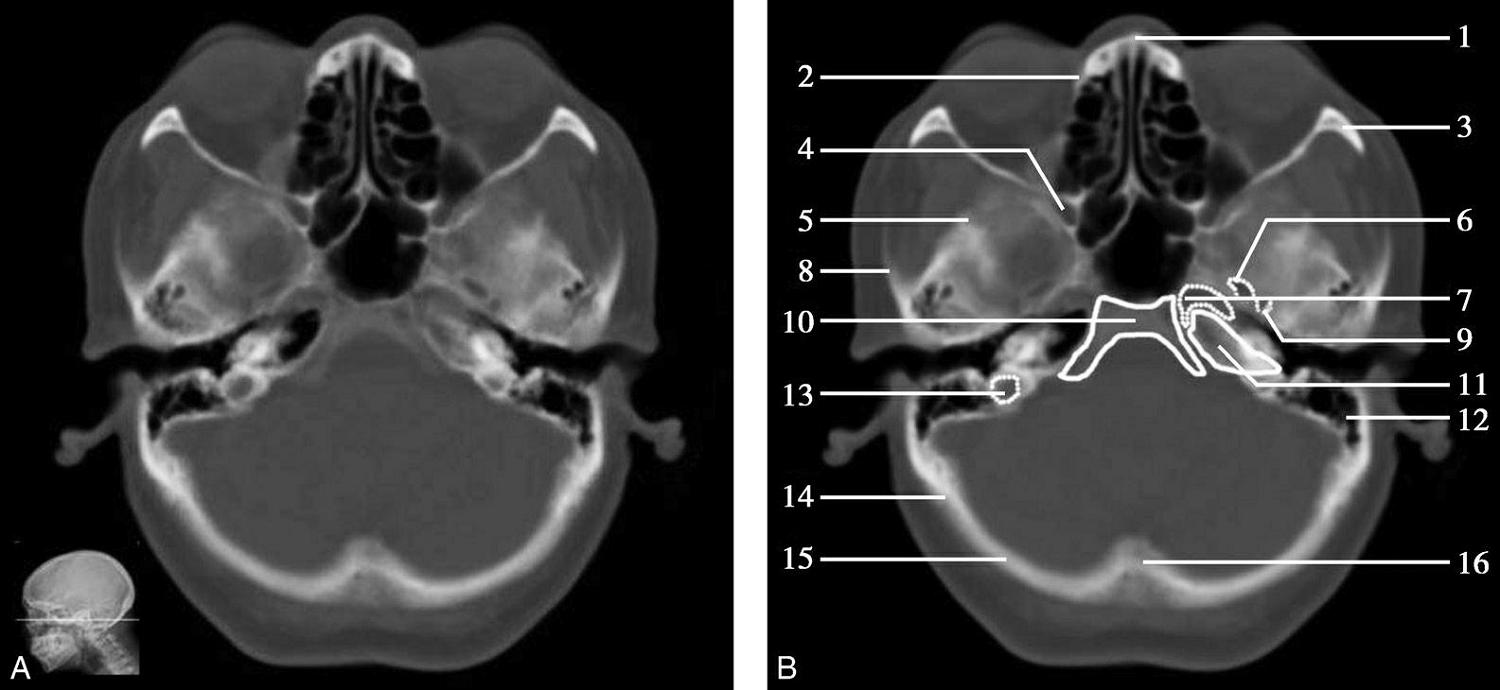 1.鼻骨;2.筛窦纸板;3.颧骨眶突;4.翼腭窝;5.蝶骨大翼;6.卵圆孔;7.破裂孔;8.颞骨颧突;9.棘孔;10.斜坡;11.颞骨岩部;12.乳突;13.颈静脉孔;14.枕乳突缝;15.枕骨;16.枕内隆凸