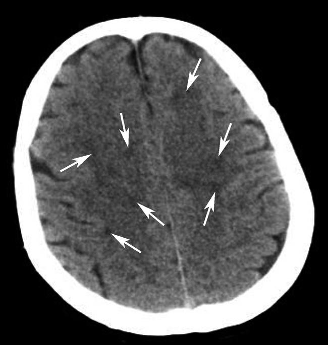 双侧额顶叶多发小片状高、低密度混杂影(箭)