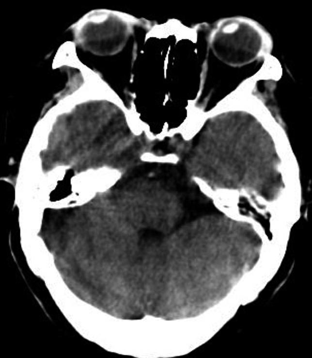 CT平扫示两侧脑桥小脑角池不对称,左侧扩大,可见低密度影,脑桥受压变形