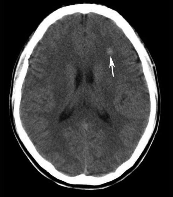 左侧额叶皮层下白质内示类圆形结节状稍高密度影(箭),CT值为53HU,边界清楚,周围未见水肿影,未见明显占位效应
