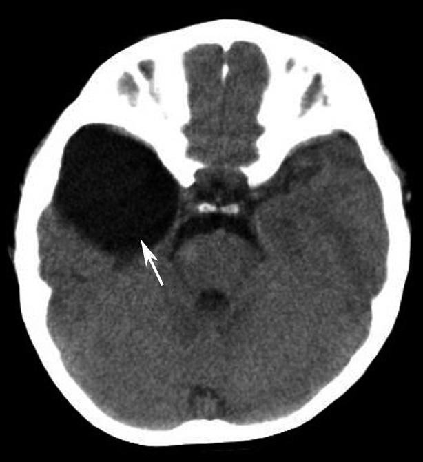 右侧颞极示一类圆形低密度影(箭),CT值为4HU,边界清晰,邻近右侧颞叶脑突质受压