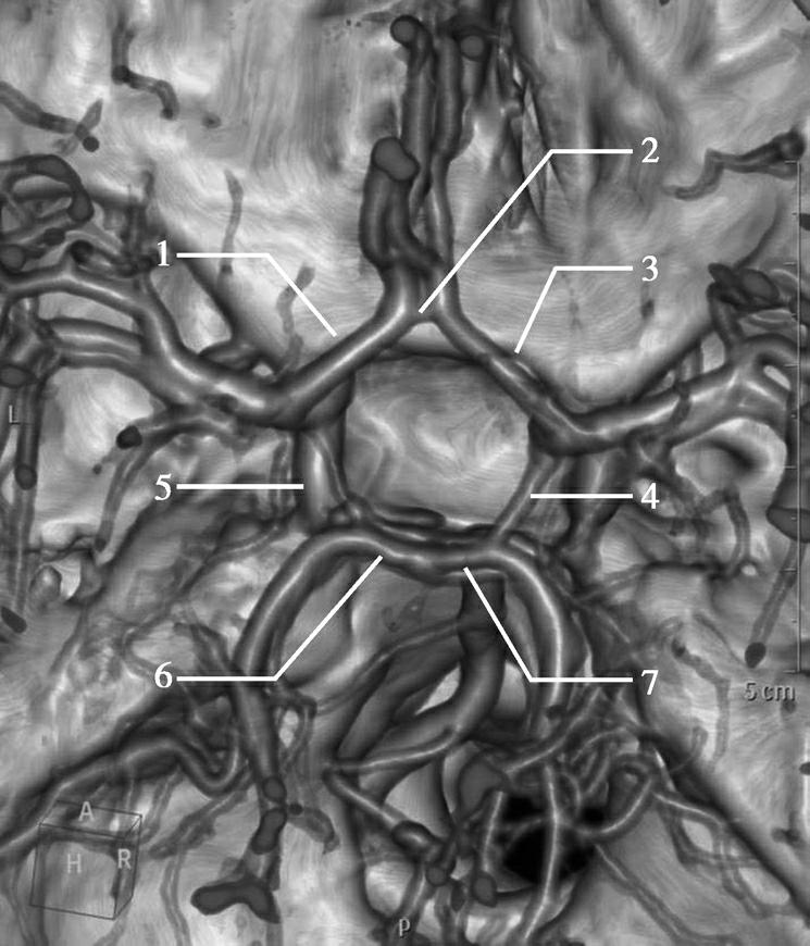 1.左侧大脑前动脉(ACA)交通前段(A 1 );2.前交通动脉(ACoA);3.右侧大脑前动脉(ACA)交通前段(A 1 );4.右侧后交通动脉(PCoA);5.左侧后交通动脉(PCoA);6.左侧大脑后动脉(PCA)交通段(P 1 );7.右侧大脑后动脉(PCA)交通段(P 1 )