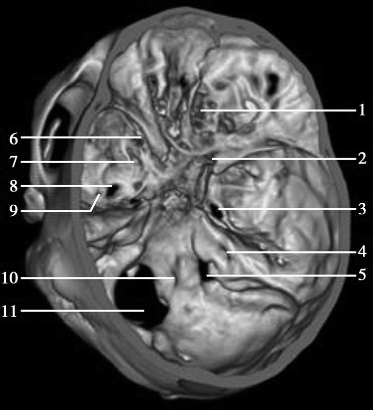 1.筛孔;2.视神经管;3.破裂孔;4.内耳道;5.颈静脉孔;6.眶上裂;7.圆孔;8.卵圆孔;9.棘孔;10.舌下神经管;11.枕骨大孔