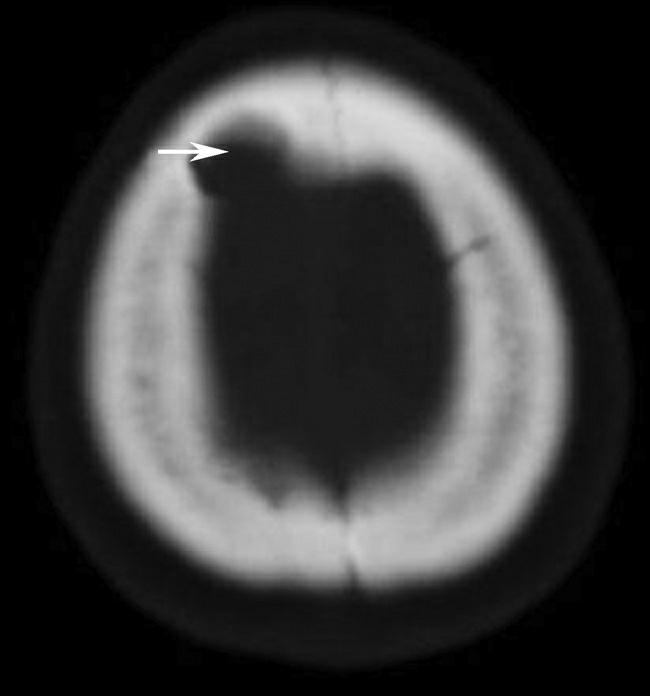 左侧顶枕部颅骨内板下示一类梭形高密度影(箭),CT值约为76HU,左侧侧脑室后角受压,中线结构右移