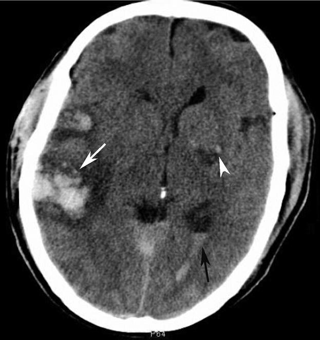 右侧颞叶(白箭)、左侧基底节区(白箭头)大片状高、低混杂密度影。左侧侧脑室后角积血(黑箭)