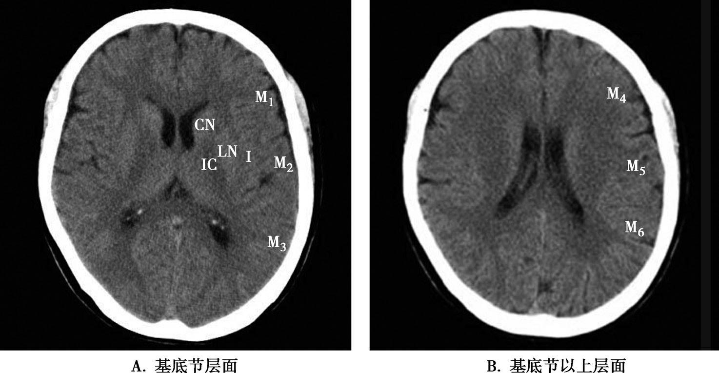 A.在基底节层面(即丘脑和纹状体平面),分为各级分支M 1 、M 2 、M 3 、岛叶(缩写I)、豆状核(缩写L)、尾状核(缩写C)和内囊(缩写IC)后肢等7个区域;B.在基底节以上层面(基底节层面上2cm),包括M 4 、M 5 和M 6 。