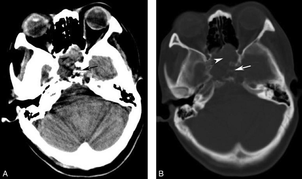 A、B.鞍区、斜坡及蝶窦腔内可见一不甚规则的占位性病变,病变以稍低密度为主(箭头),其内可见多发斑点状明显高密度影,部分斜坡骨质破坏(箭)