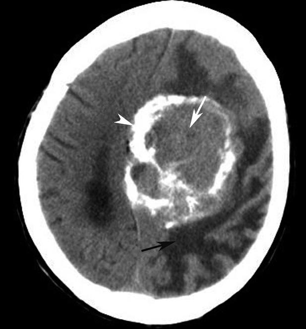 左侧额顶部镰旁巨大占位,以等密度为主(白箭),其周边可见斑片状钙化影(白箭头),肿瘤周围可见大片状水肿影(黑箭),中线结构右移
