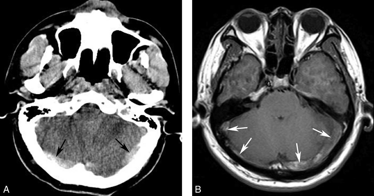 男,47岁,头痛2周,意识模糊2天,无头颅外伤史。A.CT平扫示双侧横窦增宽、密度增高(黑箭),提示静脉窦血栓;B.MRI T 1 WI提示双侧乙状窦、横窦血栓形成(白箭)