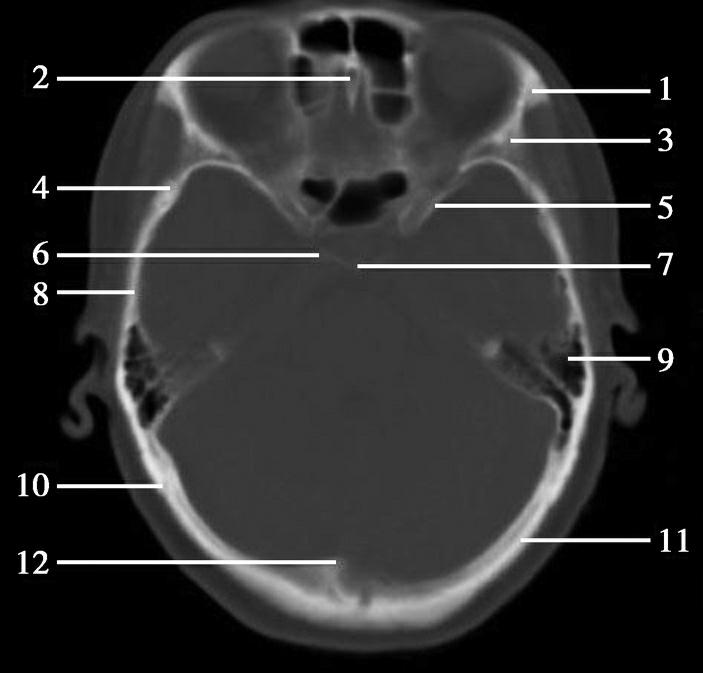 1.额骨眶突;2.鸡冠;3.蝶骨大翼;4.蝶鳞缝;5.蝶骨小翼;6.后床突;7.鞍背;8.颞骨鳞部;9.乳突;10.枕乳突缝;11.枕骨;12.枕内隆凸