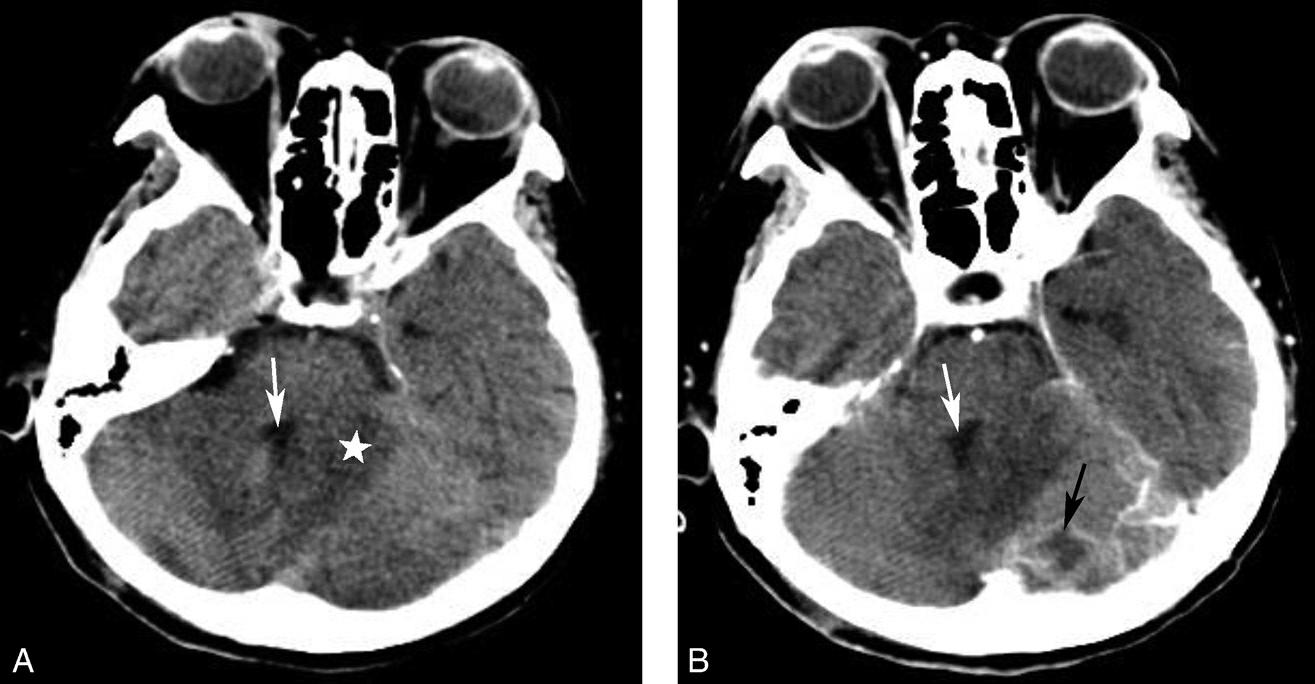 A.鞍上池前角消失,失去正常六角星形态;此例为垂体腺瘤向鞍上生长,占据此区域所致(箭);B.鞍上池闭塞;此病例为双侧大脑半球多发大面积梗死(☆),弥漫性脑肿胀,导致鞍上池闭塞(箭)