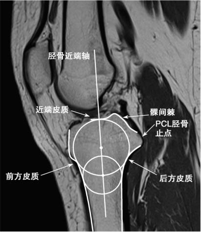 选取平面需满足以下三个要求:①可见髁间棘;②可见后交叉韧带止点;③胫骨近端呈倒凸字形。画一圆,与胫骨近端、前后侧皮质相切,在该圆的圆周上找一点作为圆心,画一个与前后侧皮质相切的圆,两圆圆心的连线为轴线。