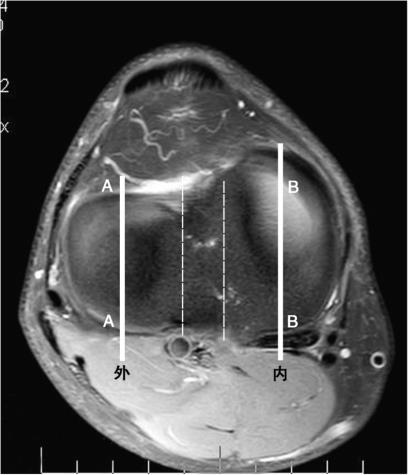 分别选取内侧平台或外侧平台中间层面测量内侧或外侧平台后倾角,AA为外侧,BB为内侧。