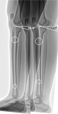 通过EOS技术拍摄标准全长侧位X线片,通过近端和远端的“双圆法”确定胫骨骨干轴线,另外标记胫骨平台的切线,切线与胫骨骨干轴线的垂线之间的夹角,即为胫骨平台后倾角。