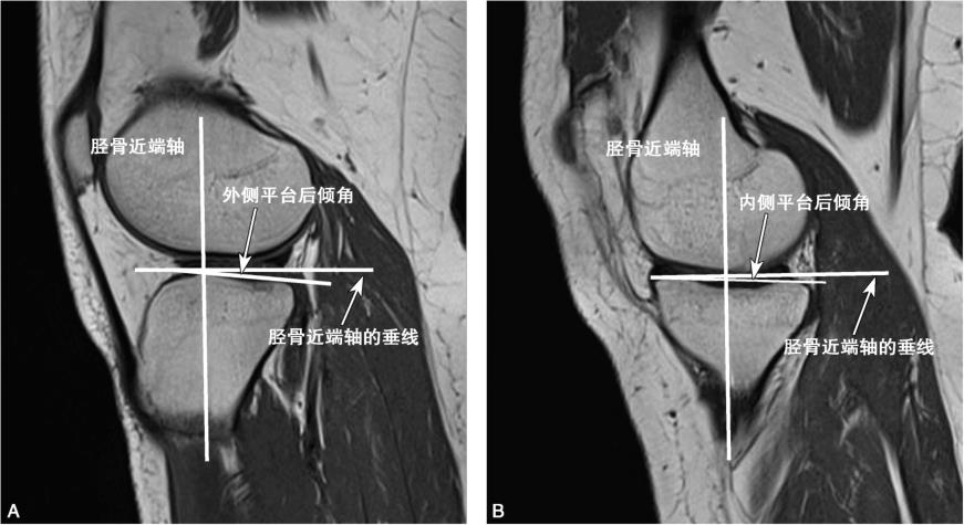 胫骨平台前后缘最高点的连线与胫骨轴线垂线的夹角为胫骨平台后倾角。前后缘连线位于垂线下方为正值,否则为负值。A.外侧后倾角;B.内侧后倾角。