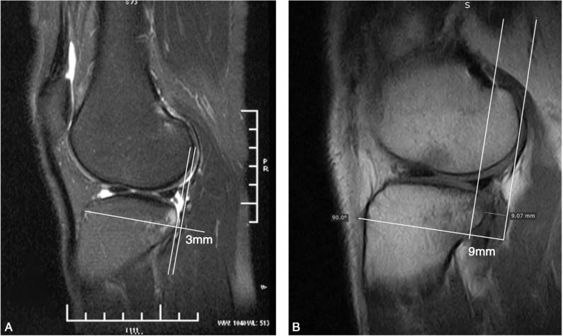 A.常规平卧位MRI测量胫骨前移数值为3mm;B.同一患者站立位MRI测量胫骨前移数值为9mm。