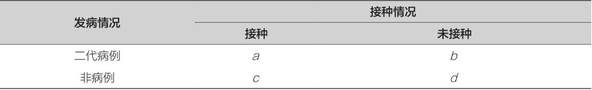 由于暴发和散发期间,所调查的接种和未接种者对疾病的暴露程度可能不同,疫苗保护效果评价结果会产生偏倚;暴发调查法和抽样调查均存在这一潜在问题。鉴于家庭内成员对疾病的暴露机会通常是相同的,为减少偏倚,可采用家庭二代病例调查。通常将某病在家庭中出现的第一病例称为“家庭原发病例”。自家庭原发病例出现后,在该病最短潜伏期至最长潜伏期之间的病例称为“家庭二代病例”。此方法考核疫苗保护效果建立在一个完好的疾病监测系统之上,否则有多个病例的家庭较只有一个病例的家庭更易被发现。与暴发调查一样,家庭二代病例研究中的二代易感者应有详细的疫苗接种史。采用此方法调查疫苗接种率的优点为,同一家庭中的易感接种者与首例病例的接触暴露机会一般较均衡,且易于测量。如果在不同的家庭中的病例采用相同的诊断标准,则研究效果较易合并。数据整理表见表4-3。