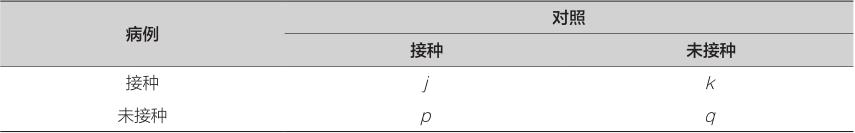 表中, j 为病例和对照都接种过疫苗的对子数; p 为病例未接种过疫苗、对照接种过疫苗的对子数; k 为病例接种过疫苗、对照未接种过疫苗对子数; q 为病例和对照都未接种过疫苗的对子数。