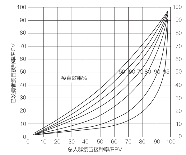 已知 PPV 和 PCV 时,可通过“疫苗保护效果曲线图”获得(图4-1)。该方法具有局限性,只能对疫苗流行病学效果做粗略的估计,且适用于那些传染病基础传播速率高的传染病如麻疹、风疹、百日咳等。