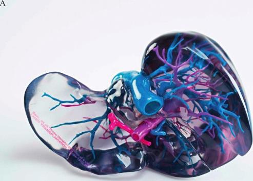 Stratasys公司的PolyJet技术同样也是喷射打印成型的一种,这种技术不需要粉末床,3D打印机喷头喷射出极细小的光敏树脂液滴,并立即用紫外激光固化,形成薄层,逐层叠加,形成精确的三维模型或零件。对于一些悬挂结构或复杂结构,3D打印机将会喷射可去除的凝胶材料进行支撑,在后处理阶段可以用手或水轻松去除。PolyJet技术的优点在于成型精度高,表面光滑,无须后续固化处理即可直接使用,同时可以使用多材料打印,即使用不同成分、不同颜色的材料进行打印,非常适合于构建医学模型。如图1-13所示,模型中不同颜色的部分代表不同的组织、血管等,让医生或医学院的学生对患者的身体结构有更清晰、准确的认识。
