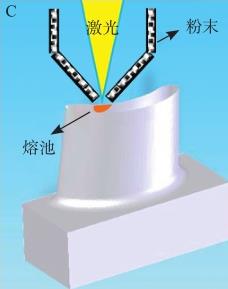 与SLM相比较,激光熔覆成型技术的主要优势在于其适合于金属零件的大功率、高效率成型。此外,激光熔覆成型技术所具有的同步材料(金属粉末、金属丝材等)送进特征,有利于实现同一构件上多材料的任意复合和梯度结构制造,进行新型合金的设计以及损伤构件的高性能修复。然而,激光熔覆成型技术难以成型具有极端复杂结构的零件,这在一定程度上限制了它的应用。