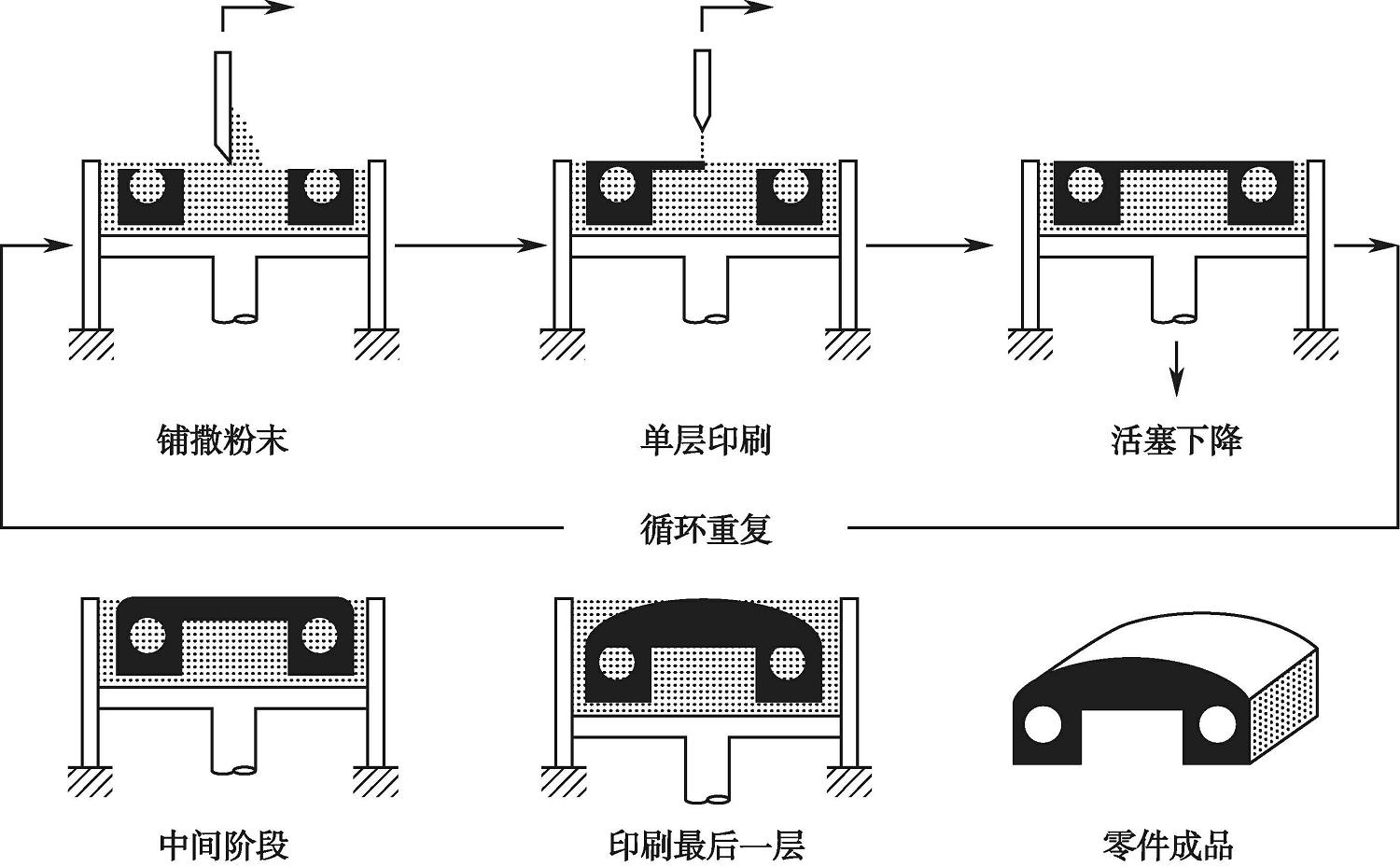 SLS的原理是将材料粉末或者粉末与黏结剂的混合物平铺在基板上并用刮粉器刮平,激光选择性地扫描构件分层后的二维截面形状,使截面轮廓内的粉末烧结在一起,得到零件的一层截面。之后,工作台下降,再平铺一层粉末并刮平,用激光根据新一层的构件二维截面形状进行选择性烧结,并保证新的一层烧结材料与上一层烧结材料牢固烧结在一起,如此反复直至整个零件成型,如图1-16所示。成型过程中未被烧结的粉末可以起到支撑作用,所以无须额外设计支撑结构。