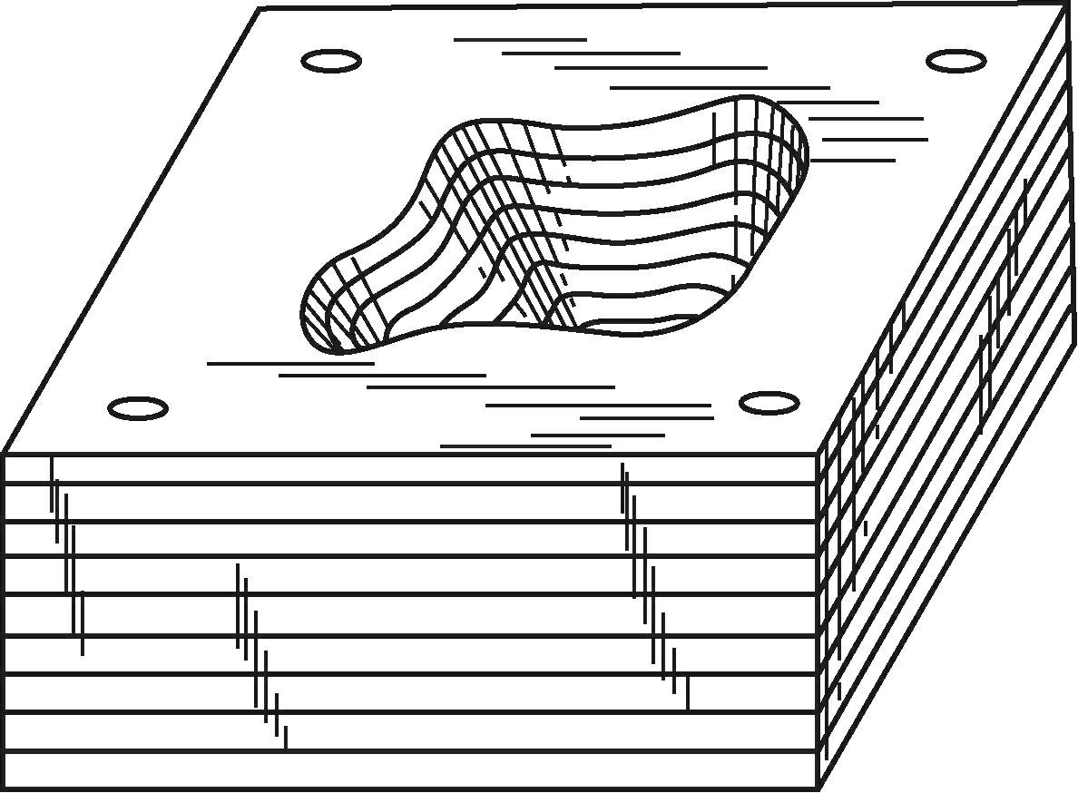 分层实体制造技术(laminated object manufacturing,LOM)是以纸张、塑料薄膜、金属薄片等片层材料为原材料,进行三维实体打印。1976年,P. L. DiMatteo进一步发展了分层构建立体地形图的方法,用铣床加工三维模型的每一层分层切片金属板,然后黏结成叠层实体,采用螺栓和带锥度的销钉进行连接加固,制作成型腔体模型,如图1-5所示,并获得了美国专利(US3932923),为之后的分层实体制造技术的发展奠定了基础。1988年,美国Helisys公司的Michael Feygin在前两种分层制造方法的基础上,成功研制了一种实用化的分层实体制造技术,其工作原理如图1-6所示。在片材表面事先涂覆一层热熔胶,将长度足够的片材卷成料带卷,用热压辊在加工时辊压片材,使之在一定温度和压力下与下面已成型的零件牢固黏结,再用激光器切割零件对应截面的轮廓和工件外框,并在零件和外框之间多余的区域内切出上下对齐的网格,激光切割完成后将工作台面下降相应片材的厚度,与片层料带分离,送料系统将新一层薄片材料叠加上去,如此反复直至零件的所有截面黏结、切割完成,去除成型零件周围已经切割成网格的多余区域的材料,得到分层制造的实体零件。分层实体制造技术只需切割出零件截面的轮廓,而不需要扫描整个截面,所以可以进行大型模型的快速制造。但是由于在层与层之间是黏结的,力学性能不高,只适合模型制造,例如医用头骨模型。此外,工件外框与零件外轮廓之间的多余材料在加工过程中起到了支撑作用,所以分层实体制造技术无须添加支撑。