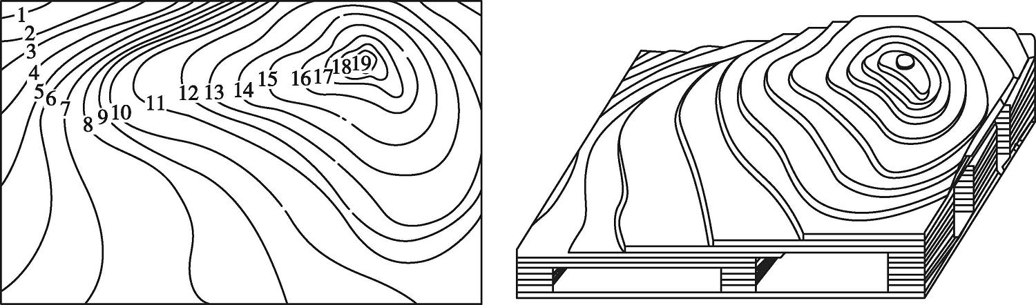 然而,每一项先进技术都不会凭空产生,总有孕育过程,3D打印技术也不例外。3D打印技术的成型原理最早可以追溯到1892年的一份美国专利(US473901)。该专利建议用分层法构建立体地形图,即将地形图等高线轮廓压印在蜡片上,然后沿轮廓线裁剪蜡片,并将裁剪好的蜡片按等高线的顺序和位置黏结在一起,构成三维地形图模型,如图1-1所示。在之后近百年时间内发展出了各种各样的分层制造方法,与此相关的专利有数百个之多。