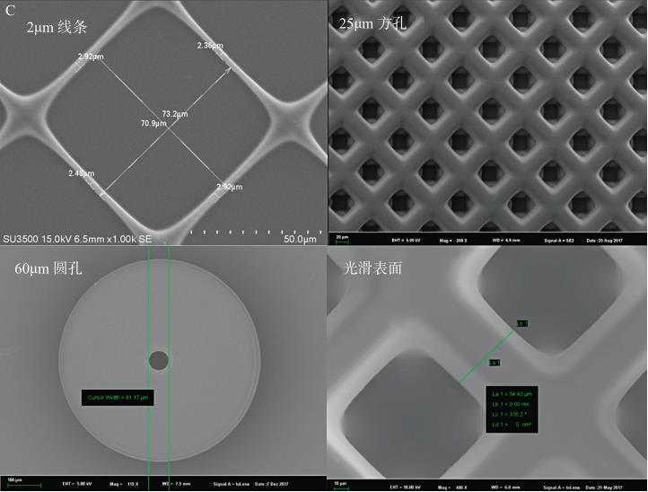 随着数字微镜设备(digital micromirror device,DMD)的发展,光固化法中的光源由激光发生器替换为DMD芯片,激光光斑扫描液态光敏树脂的方式变换为平面图案照射液态光敏树脂的方式,不需要逐点、逐线地扫描,而可以直接一层一层地固化制造出三维立体零件,并发展形成了面曝光投影光固化技术(mask projection stereolithography,MPS),或称为数字光处理技术(digital light processing,DLP)。2015年Carbon 3D公司在此基础上进一步推出了连续液态界面制造技术(continuous liquid interface production,CLIP),并于同年获得美国专利(US9205601B2)。如图1-3A所示,运用CLIP技术的3D打印机结构独特,盛放液态光敏树脂的液槽底部为一种可以透过氧气并同时能透过紫外光材料,数字光处理成像设备产生的紫外激光投影从液槽底部照射液态光敏树脂,由于氧气阻碍被照射的光敏树脂固化,与液槽底部接触的光敏树脂始终保持液态,形成“死区”,死区上方光敏树脂在支撑平台上固化,产生了一个可以连续生长的光敏树脂固-液界面,随着支撑平台上升,周围的液态光敏树脂由于吸力补充并连续固化,形成三维实体。该技术打印过程中不需要一层固化打印完成后关闭激光器并为下一层打印做准备工作,节省了大量的时间,而且相比传统的光固化3D打印技术,CLIP技术在提升打印精度、降低分层切片厚度的情况下也不会增加成型时间,因为改变精度只需加快紫外激光投影变化的速度,而成型速度不受影响。这样不仅大大提升了固化的速率(由每小时几毫米提升至500mm/h),同时产品表面更加顺滑,力学性能更高,产品质量与注塑零件相当,甚至更好。图1-3B、C则分别展示了另一种面曝光光固化技术——面投影微立体光刻(Pμlse)原理,以及相应成型的微纳结构。