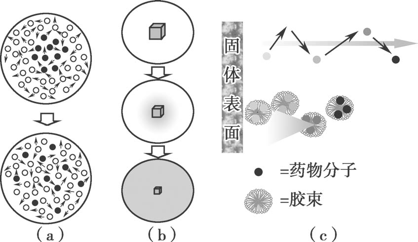 (a)墨滴在水中的扩散;(b)药物在非搅拌条件下的溶出;(c)药物单体、胆汁胶束-药物结合物的扩散