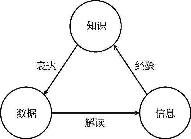 信息的采集、交流与应用普遍存在于人类社会当中。人类对于世界的理解大致可分为三个层面,即数据层、信息层和知识层,其结构如图1-3所示。数据层是未经过组织的事实与符号,信息层是被有意识结构化的事实与符号,知识层则是在社会实践中可以进行应用的理论化信息。这三个要素构成一个解读、经验积累与表达的循环过程。从设计的角度而言,信息是将数据转化成有价值的内容,并构造文脉环境、使得其能够易于被用户理解,最终转化成用户可以进行应用的知识。信息虽然可以帮助人们了解事物运动的状态到底是什么,这种状态将以什么方式转变,但不一定具备普遍抽象的本质。因此,信息具有可以被转化成知识的基础,但其本身并不能够被称为知识。