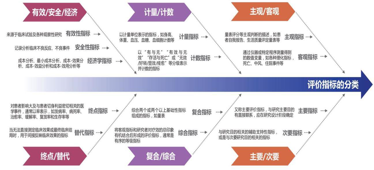 一个临床研究可能会包含多个指标,包括有效性指标、安全性指标、经济学指标等,既可能有客观指标,也可能有主观指标,但指标选用一定要与研究目的及临床价值相关联,明确主次之分。在数量方面,指标不是越多越好:指标太多,一方面增加试验费用,给研究者增加负担,导致研究者依从性下降;此外,多个指标采集需要更长的时间,特别是量表填写和生化检查,会影响受试者的依从性,导致失访增加。因此,不能期望一个研究解决多个问题,指标数量应与主要研究问题相匹配。