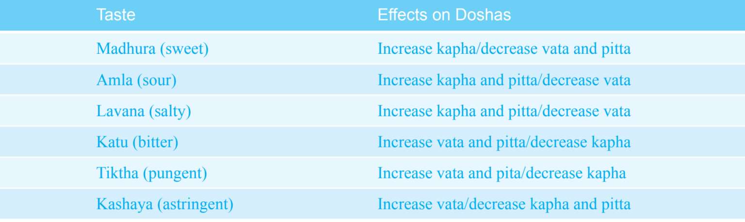 Other properties such as taste can have a profound impact on an individual’s dosha,dhatus, malas and agni. Ayurveda delineates a total of six tastes. Table 1–3 shows the effects of the six taste on the three doshas.