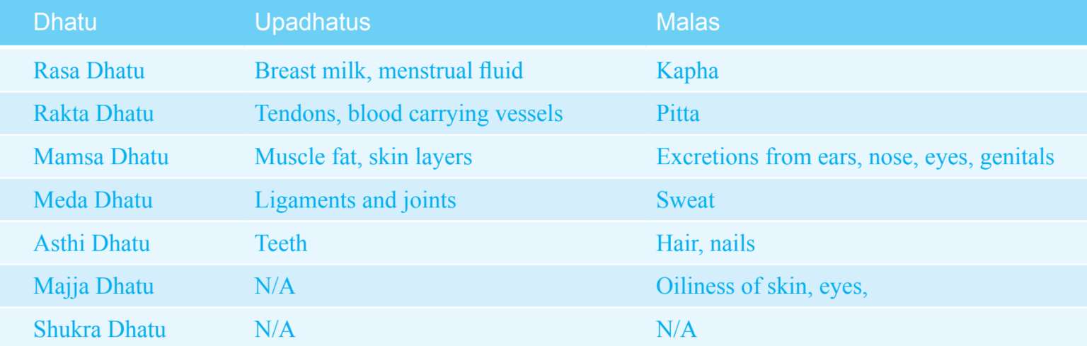 During the formation of dhatus, upadhatus(secondary tissues) and malas (waste products) are produced. Table 1–2 shows the secondary tissues and waste products associated with the various dhatus.