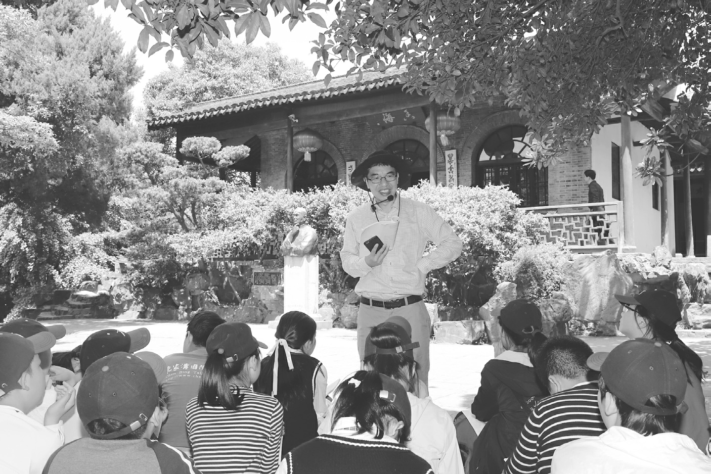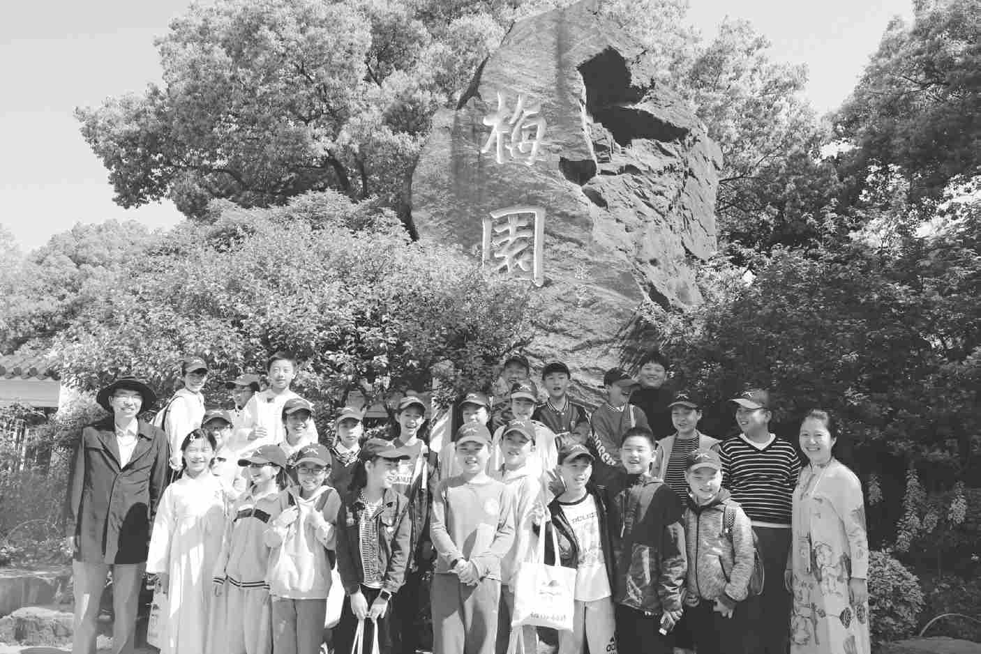 钱歌川看到的和我们今天所见几乎一样,“举目四顾,一片梅林,几无杂树”。看到“几无杂树”,你们会想起什么?(童子:《桃花源记》。)《桃花源记》中怎么说的?(童子:中无杂树,芳草鲜美,落英缤纷……)钱歌川活用了“中无杂树”。如果他也说“中无杂树”,那就不够恰当,他改了一个字,变成“几无杂树”,就很好。你们抬头看看,有没有杂树?远远看去,除了梅树还有别的,比如桂花树,钱歌川那个时代一定也有一些杂树。他改动一个字,既突出了梅树,又合乎事实——还有其他的树。准确地使用母语,有时候就是一字之差。钱歌川的“可惜我们来时已在夏初”,这个“可惜”,就像钱穆教小学生写作文“可惜咸了些”一样,“可惜”就是拐一个弯,说话有了曲折。