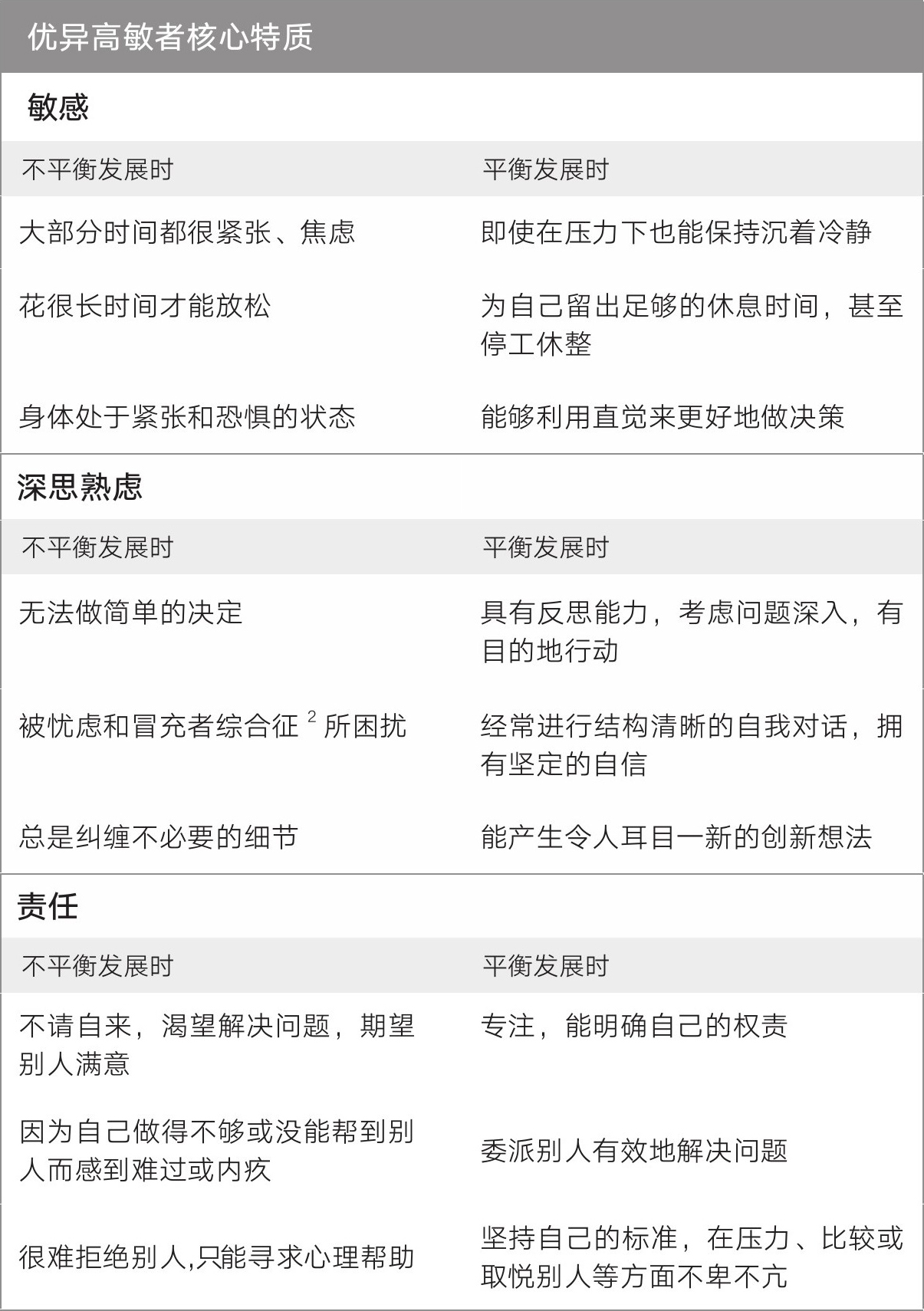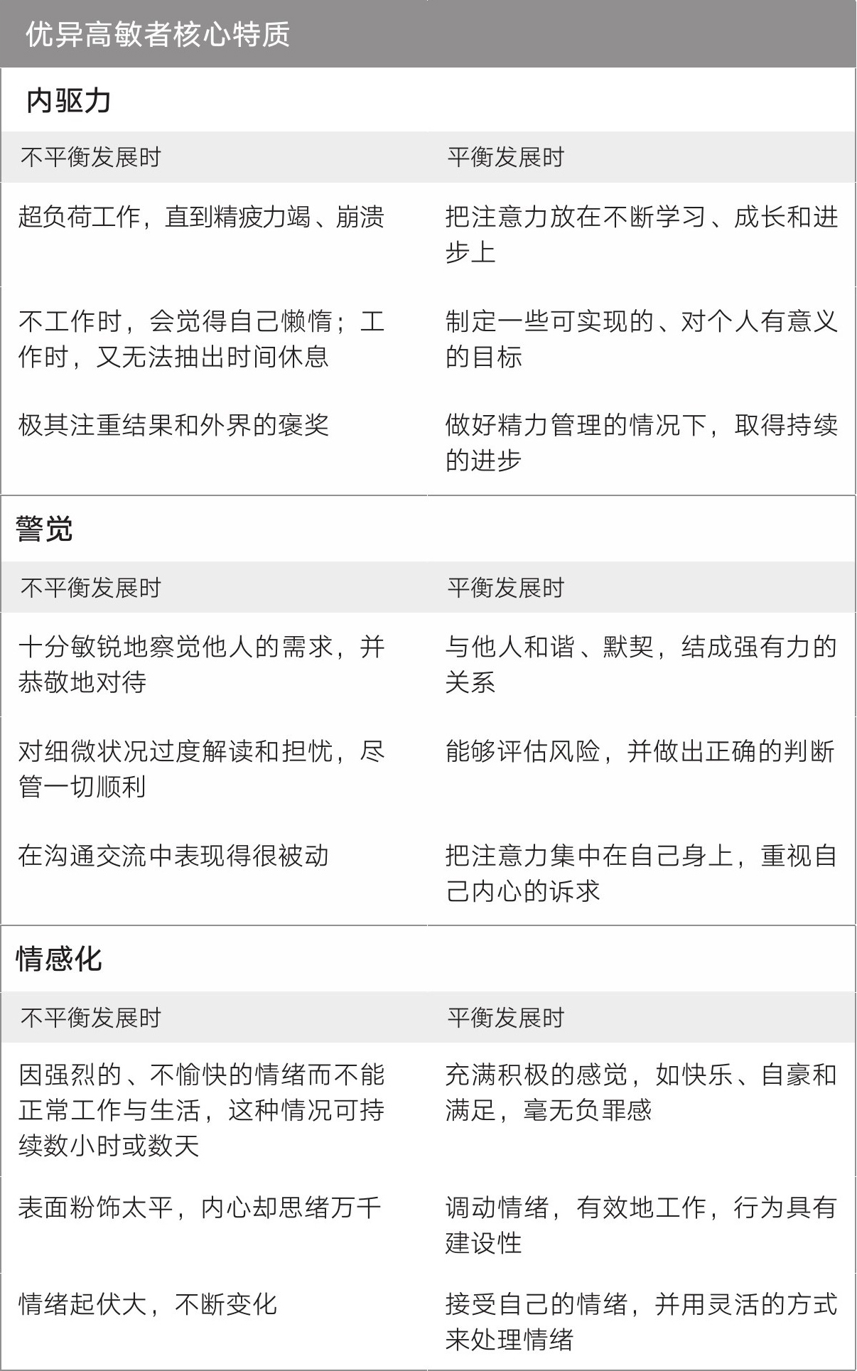 下面这张表可以帮助你理解优异高敏者六种核心特质在发展平衡与不平衡时的对应表现。