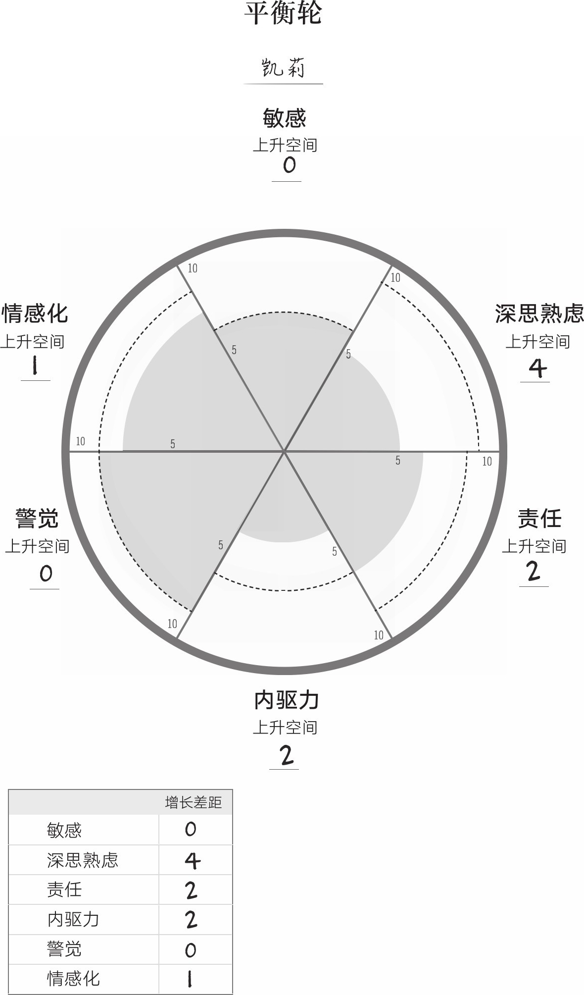 这里我想向你介绍一种可视化工具——平衡轮,帮助自己确定优异高敏者特质的平衡程度。我将凯莉的平衡轮展示给大家,大家也可以自己尝试一下。