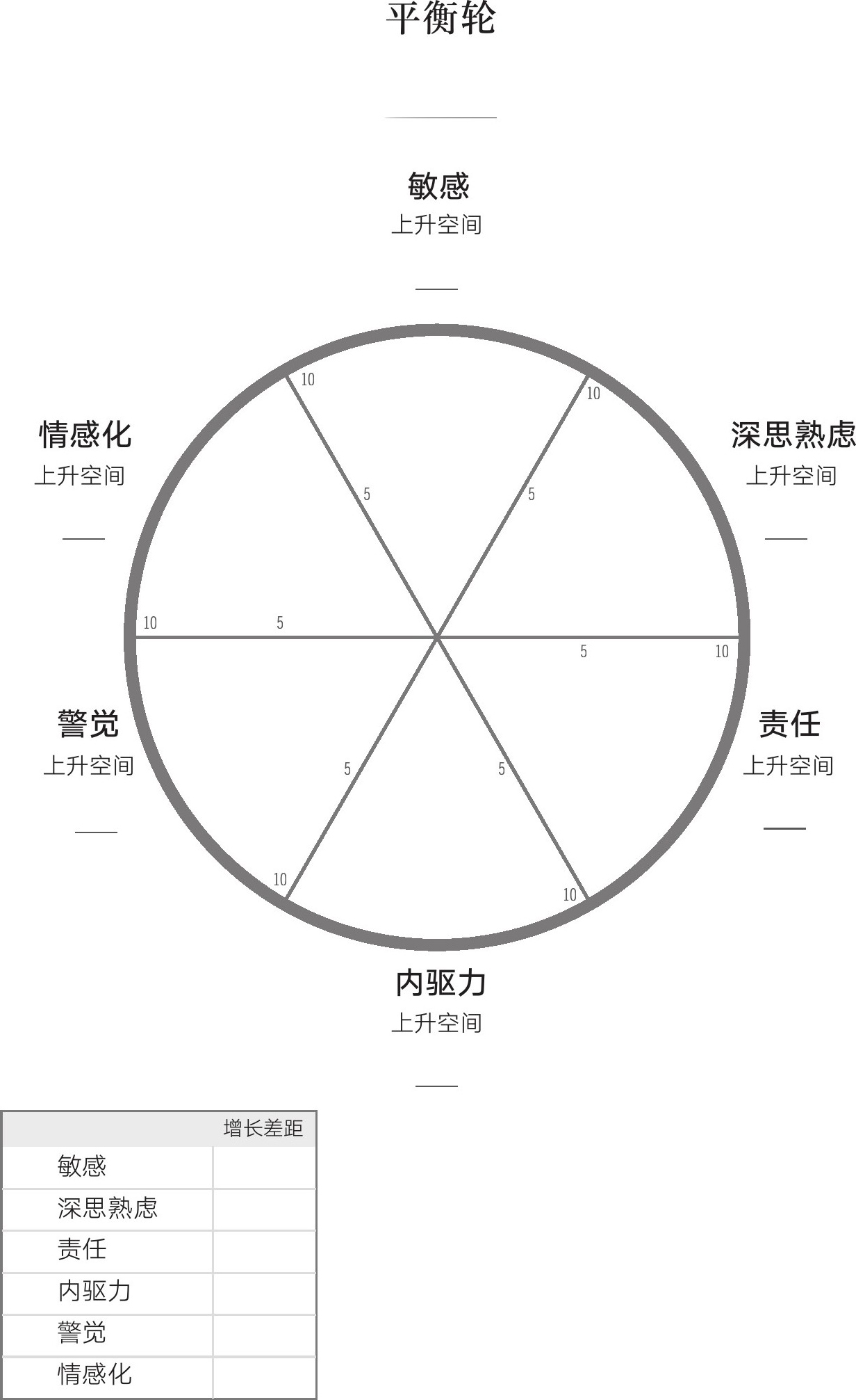 1.给自己打分。 还记得你之前完成的“优异高敏者核心特质量表”吗?请将每个答案取平均值,这样每种特质都会得到一个分数。平衡轮上的每个切块就代表你目前的平衡程度。