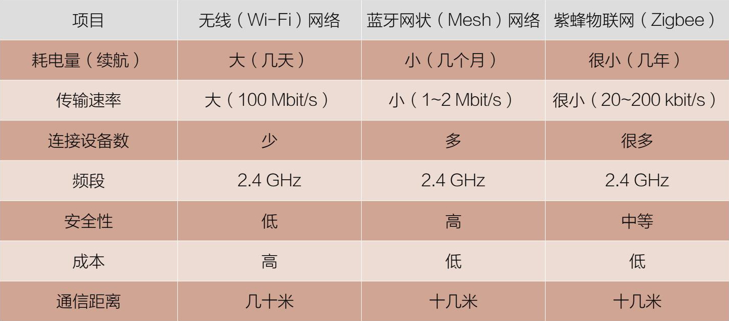 回到无线智能家居系统中,网关的作用就像是一个智能家庭的中心(中枢),让内部的智能家居系统可以和外界的互联网进行连接。网关一般是通过网线或者无线(Wi-Fi)连接,与互联网互联互通,智能设备之间一般是通过蓝牙或者紫蜂物联网(Zigbee)进行连接。不同的连接方式响应的时间、速率、耗电等都不相同,具体参见下表: