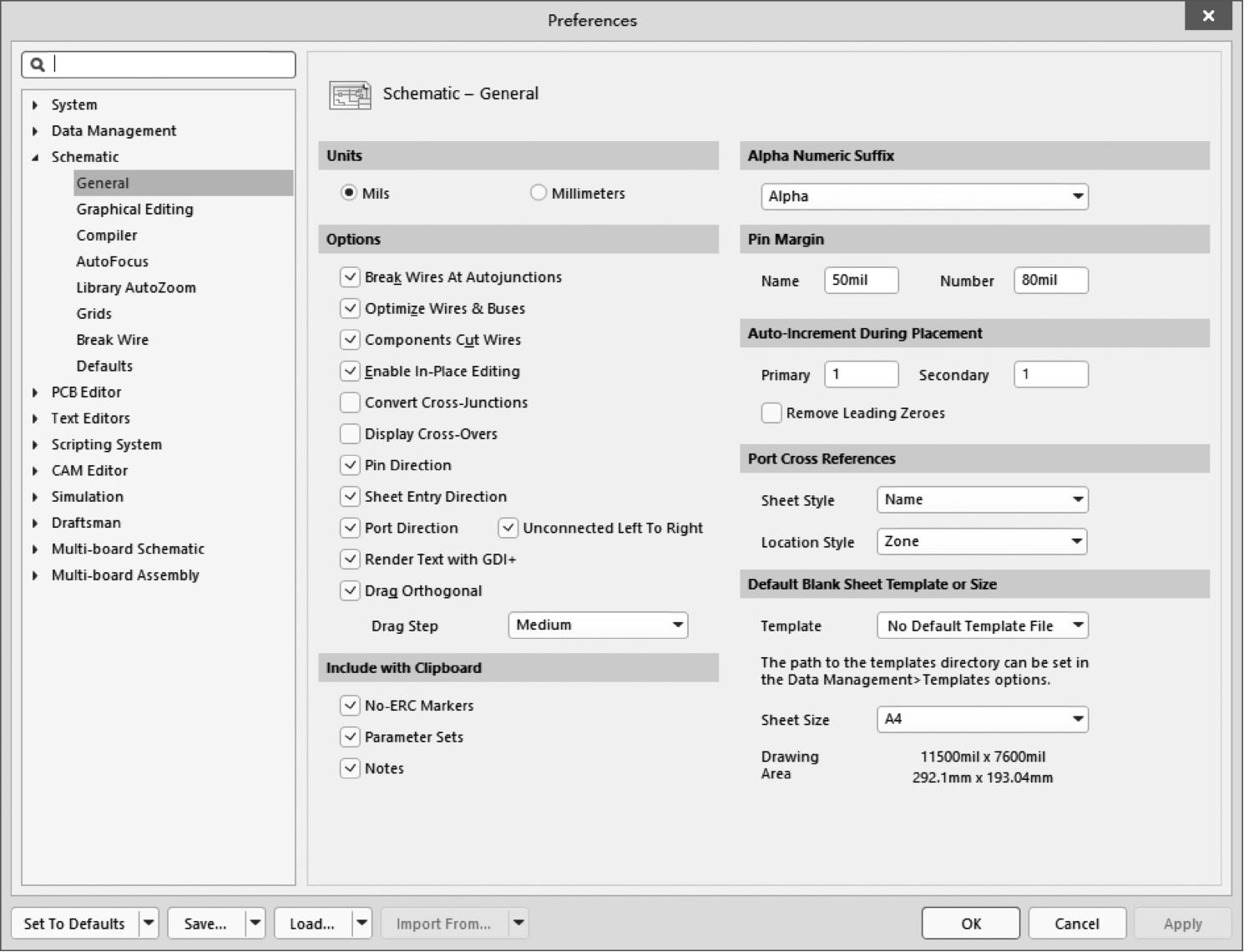Altium Designer工作环境主要在“Preferences”对话框“Schematic”选项下的“General”选项卡内设置,具体选项如下。
