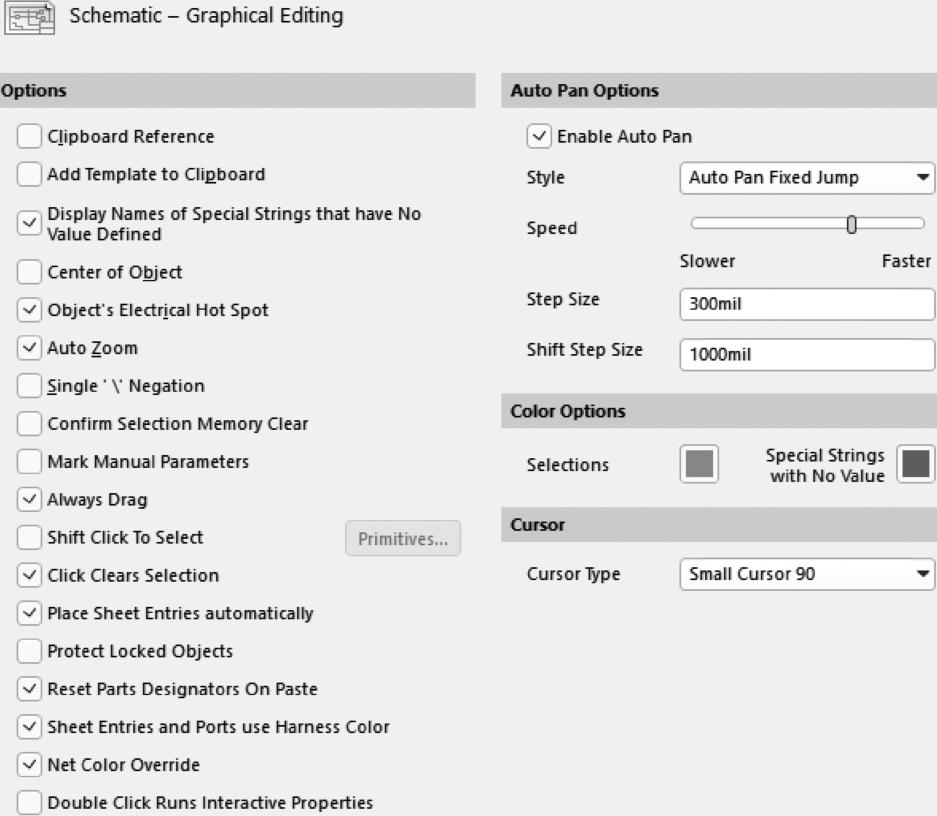 图形编辑环境的参数设置通过“Graphical Editing”选项来实现,如图2-17所示。该选项卡主要对原理图编辑中的图像编辑属性进行设置,如鼠标指针类型、栅格、后退或重复操作次数等。