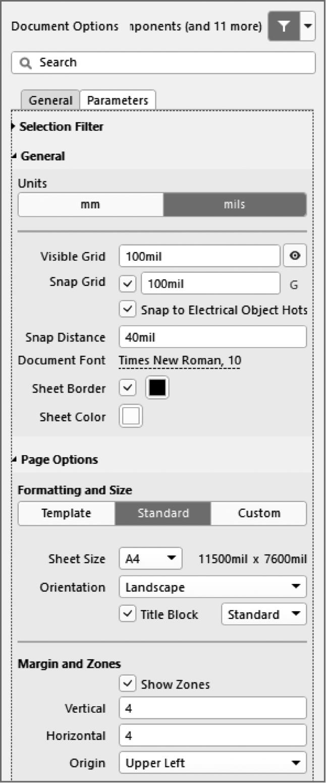 在原理图编辑环境下双击边框,或者单击右下角“Panels”按钮,在弹出的菜单中选择“Properties”选项,屏幕上将打开图2-18所示的“Document Options”属性面板,可以在这个对话框中进行图纸参数的设置。