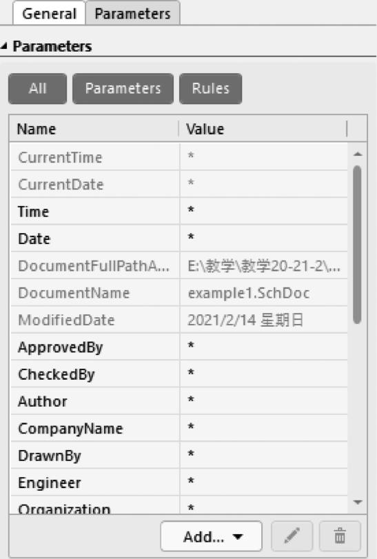 在图2-18中,打开“Parameters”选项卡,如图2-23所示。该选项卡是一个列表窗口,在列表窗口内可设置文档的有关变量,如设计公司名称与地址、图样的编号及图样的总数、文件的标题名称与日期等。具有这些参数的对象可以是一个元器件、元器件的引脚或端口、原理图的符号、PCB指令或参数集,每个参数均具有可编辑的名称和值。
